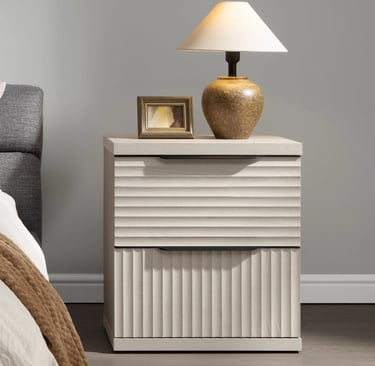 The two drawers provide practical storage for everyday items like books, small accessories, or personal essentials, helping you keep the room tidy without overloading the space. The textured front adds a subtle design detail without making it feel busy, so it works well in both modern and neutral setups.